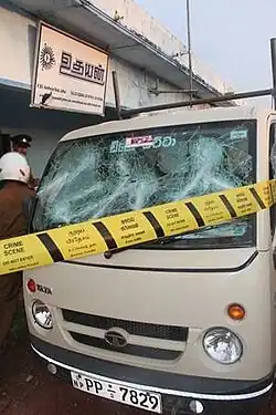 - 3 April – The Uthayan newspaper's office in Kilinochchi were attacked by a group of six masked Sinhala-speaking men, injuring five employees, two seriously, and damaging equipment and vehicles.[39][40][41][42][43]
