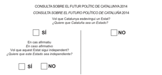 According to the consultation decree, "in the consultation there is a first question followed successively by a second question, and they are worded as follows: a) Do you want Catalonia to become a State? (Yes/No); If so: b) Do you want this State to be independent? (Yes/No). You can only answer the question under Letter b) in the event of having answered "Yes" to the question under Letter a)."[6] The "participation process" that has replaced the "non-referendum consultation" maintains the same two questions.