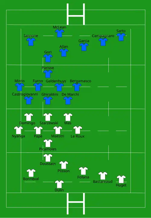 | Try: Picamoles 42' c Fofana 45' c Bonneval 51' c Con: Doussain (3/3) 43', 46', 52' Pen: Doussain (3/5) 26', 33', 38' | Report[27] | Try: Iannone 76' c Con: Orquera (1/1) 77' Pen: Allan (1/2) 28' Garcia (0/2) |