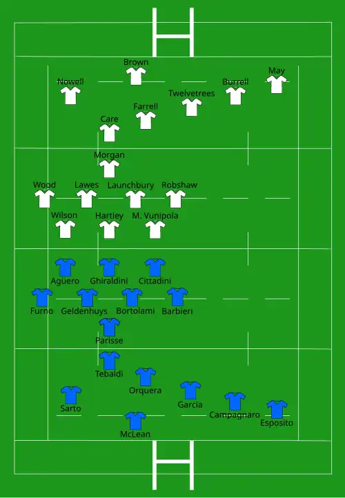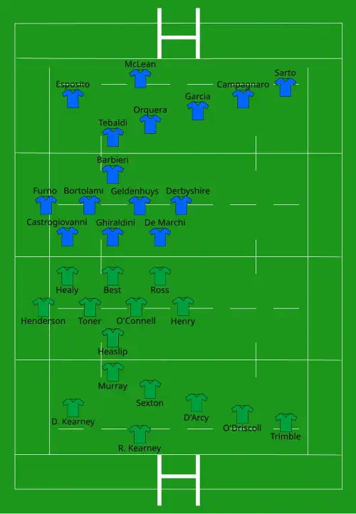 | Try: Sexton (2) 6' c, 59' m Trimble 37' c Healy 52' m Cronin 68' c McFadden 77' c McGrath 80' m Con: Sexton (2/4) 6', 39' Jackson (2/3) 69', 77' Pen: Sexton (1/1) 31' | Report[33] | Try: Sarto 24' c Con: Orquera (1/1) 25' |