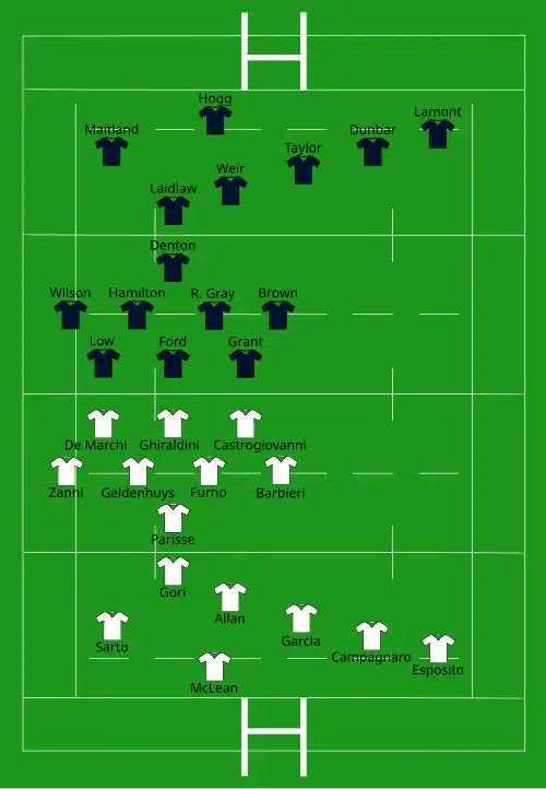 | Try: Hogg 12' c Seymour 22' c Con: Laidlaw (2/2) 13', 22' Pen: Laidlaw (0/1) Weir (1/2) 61' | Report[36] | Try: Huget 45' c Con: Machenaud (1/1) 46' Pen: Machenaud (3/4) 1', 10', 16' Doussain (1/1) 78' |