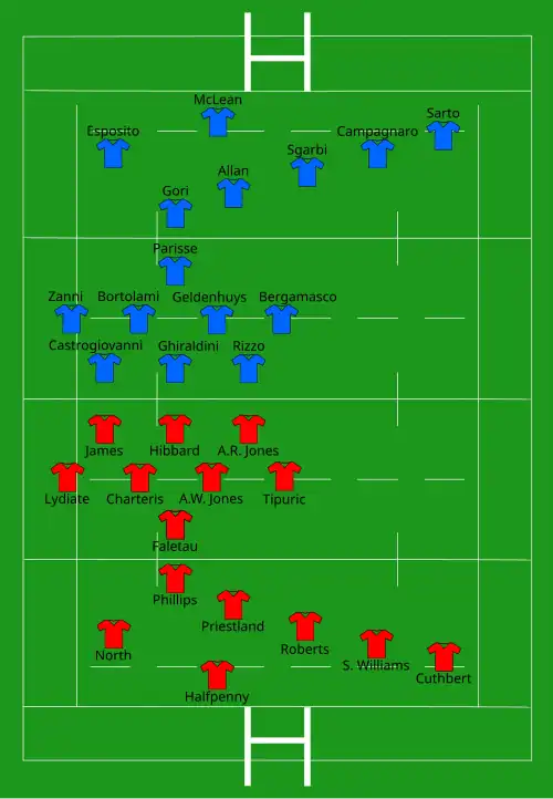 | Try: Cuthbert 3' c S. Williams 37' c Con: Halfpenny (2/2) 4', 39' Pen: Halfpenny (3/4) 28', 66', 73' | Report[20] | Try: Campagnaro (2) 42' m, 68' c Con: Allan (1/2) 69' Pen: Allan (1/2) 13' |
