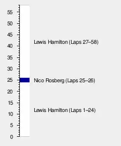 Hamilton maintained the race lead while saving fuel before increasing his pace until the end of lap 25, when he made a pit stop for a new set of the medium compound tyres. He resumed the lead from Rosberg after he too had to make a pit stop for new medium compound tyres.[27][53] During this series of pit stops, Sebastian Vettel gained a position by passing Felipe Massa for third place.[58][59] On lap 34, Max Verstappen retired from the race while running in sixth place after the rear of his Toro Rosso car was engulfed by smoke due to an engine failure.[27][51] On lap 41, Räikkönen also retired at turn four after the mechanic was unable to fully tighten a cross-threaded left-rear wheel peg that had been embedded in a stub axle during a pit stop, causing his left rear tyre to come loose.[27][51][53] This put Jenson Button briefly into the tenth and final points position but for Sergio Pérez quickly passing the McLaren-Honda driver after a 42-lap battle that begun at the start, for last position.[53][59]