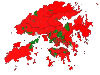 A historic turnout rate of 47 percent turnout rate was recorded in the election, of which ten constituencies with the highest turnout rates were all middle-class residential districts.[15] The pro-Beijing camp remained control of all 18 District Councils with the Democratic Alliance for the Betterment and Progress of Hong Kong (DAB) the largest party far ahead of the others with 119 seats. The pan-democracy camp failed to reclaim control of the Kwai Tsing District Council which they won majority of the elected seats but was balanced by the appointed seats in the last election. Both pan-democrats and pro-Beijing camp won 19 seats in the Sha Tin District Council but pro-Beijing retained control with the ex officio seat of the Sha Tin Rural Committee Chairman.
