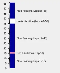 Up in front, Hamilton put his three-stop strategy to good use, consistently setting the fastest laps on track. On lap 46, Rosberg made a pit stop for the second and final time, emerging just a few seconds ahead of Hamilton, who quickly moved past him into the lead. Hamilton came in for his last stop on lap 51, easily retaining second place in front of Vettel's Ferrari. He subsequently tried to close the gap to Rosberg in front, but a 19-second lead proved impossible to overcome in the remaining 14 laps. Räikkönen had closed in on Valtteri Bottas and tried to overtake him during the last laps of the race, but was eventually unable to do so, leaving him in fifth position, lamenting his poor qualifying performance. As the race drew to a close, Rosberg crossed the line for his first victory of the season and the ninth of his career.[21] Rosberg's victory made him the ninth different winner of the Spanish Grand Prix in as many years.[22]