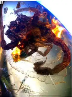 A scorpion belonging to the superfamily Buthoidea and the family Palaeoburmesebuthidae.[5] The type species is Betaburmesebuthus kobberti Lourenço & Beigel (2015); genus also includes B. bidentatus Lourenço (2015) and B. muelleri Lourenço (2015).[6] |
