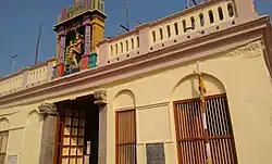 "Asthira Devar" — (‘Trishul’ with images of the respective Gods) of each temple were brought and ‘abishekams’ were performed. At the auspicious time, priests took the ‘Asthira Devars’ and immersed them in the tank and bathed, signaling the fulfillment of the "Theerthavari".[22][23] The Tirttavari Trial for Tirttavari was held on 6 February 2016.[24] For Shiva temples it was held on 22 February 2016 between 12:00 noon and 1:30 p.m. in the Mahamaham Tank. For five Vishnu temples it was held on the banks of Kaveri. Those five temples are Sarangapani Temple, Chakrapani Temple, Ramaswamy Temple, Rajagopalaswamy Temple, and Varahaperumal Temple.[3][25] During Tirttavari, processional deities of 12 Shiva temples were kept on the Nandi vahana and went around the town's main streets. Later, in the Mahamaham tank, special abisegam sprinkling rituals were held to Astra devars, and Tirttavari was held. For five Vishnu temples, Tirttavari was held to astradevars at Sarangapani Tirttavari mandapa, near to Sakkarai ghat, known as Sakkara paditthurai in Tamil.[26]