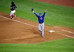 For Game 5, former Cubs star and Hall of Fame member Ryne Sandberg threw the ceremonial first pitch before the start of the game, former Cubs public address announcer and former Chicago Blackhawks anthem singer Wayne Messmer performed the national anthem, and Pearl Jam lead singer Eddie Vedder (a Chicago native and die hard Cubs fan) sang "Take Me Out to the Ball Game" during the seventh-inning stretch.[58] José Ramírez hit a home run for Cleveland in the second inning off Jon Lester,[59] but the Cubs, facing elimination, scored three runs in the fourth inning off Trevor Bauer. Kris Bryant led off the inning with a home run. After Bryant's home run, Anthony Rizzo doubled and Ben Zobrist singled. Addison Russell's RBI single put the Cubs up 2–1. After Jason Heyward struck out, Javier Baez's bunt single moved Zobrist to third before David Ross's sacrifice fly made it 3–1 Cubs.[60] The Indians cut their deficit to 3–2 off Lester in the sixth on Francisco Lindor's RBI single that scored Rajai Davis from second base. With the tying run on second base in the seventh inning, Maddon brought in Aroldis Chapman, who threw 2+2⁄3 scoreless innings, earning his first save of the series and fourth overall in the postseason.[61] The win was the first World Series game victory for the Cubs at Wrigley Field since 1945.