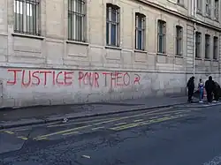 Théo also received public support of actor and comedian Omar Sy, rapper Youssoupha, from Valérie Damidot, singer Imany, the director and actor Mathieu Kassovitz.[25][26] On 15 February, dozens of artists published a message of support for Theo L. in Libération, written by a councilor of Brétigny-sur-Orge, Steevy Gustave, a former event manager for SOS Racisme,[27] making some suggestions in order to improve the performance of law enforcement.[28] The supporters included Patrick Bruel, Hugues Aufray, the comedians Josiane Balasko, Jean Benguigui and Mathilda May, director Nils Tavernier, the Avignon festival director Olivier Py and comedian Anne Roumanoff. Other media in this case made a more general denunciation of certain police methods.[29][30][31]