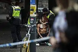 On 31 August 2017, policeman Ted Eriksson and his colleague patrolled the area around Medborgarplatsen and Björns trädgård in Stockholm in conjunction with a sit-in protest concerning deportation of Afghan migrants from Sweden. The perpetrator, who had previously taken part in the protest,[1] unprovokedly stabbed Eriksson in the neck from behind, the seriousness of the attack didn't cause any fatal injuries despite the spinal cord was punctured and the vertebra was fractured.[2][3][4][5][6]