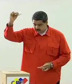 In the days leading to the election, workers of state-owned companies were warned that their jobs would be terminated the following day if they did not vote in the election.[55] Furthermore, each worker was required to take another 10 voters to the elections, which would be tracked by the authorities.[56] Management workers of state-run entities were threatened with being fired as well if they or their employees refused to vote. Many public workers remained conflicted due to the threat of being fired, knowing that their job benefits from the government would be cut and that their identity could be revealed in a similar manner to the Tascón List incident during the Venezuelan recall referendum in 2004.[57] More than 90% of the workers did not obey the Bolivarian government's call to participate, which led to massive firings following the elections.[56]