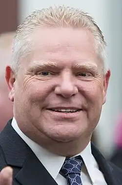 Doug Ford, 60, is a businessman and politician who is currently seeking the PC nomination in Etobicoke North for the upcoming June 2018 provincial election.[106] Ford is the brother of former Toronto Mayor Rob Ford, and son of former Etobicoke-Humber MPP Doug Ford Sr. He was a member of Toronto City Council during his brother's term as mayor (2010–2014) and the runner-up in the 2014 Toronto mayoral election.[107][108] Ford announced on February 1, 2018, that he would devote his energy to the leadership race and was no longer intending to run in the 2018 Toronto mayoral election.[109]