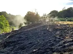 From late afternoon on 30 June, up to 45 firefighters from Staffordshire Fire and Rescue Service batted a blaze between Thorncliffe, Shawfield and Royal Cottage in the Staffordshire Moorlands.[44] A further fire broke out in woodland near Alton Towers on 2 July.[45] A separate wildfire broke out over a month later, on the afternoon of 9 August at Upper Hulme.[46] This continued to burn the rest of the month and, at its height, covered a significantly larger area than the two earlier fires in the county. Despite a period of rain, which initially helped,[47] windy conditions meant the fire spread[48] to cover 219 acres by 11 August.[6][46] Smoke from the fire had reached Sheffield and parts of North Derbyshire, 28 miles away.[49][50]