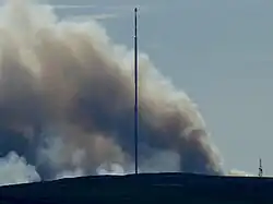 A large wildfire broke out on Winter Hill, north of Bolton in Greater Manchester, at around 3:20 pm on Thursday 28 June 2018; near the Winter Hill transmitting station. Initially, five fire engines from Greater Manchester and seven from the Lancashire Fire and Rescue Service were sent to tackle the blaze with specialist fire-fighting equipment. They were supported by firefighting teams from United Utilities and volunteers and vehicles from Bolton Mountain Rescue Team, and later other local volunteer teams including Lancaster Area Search and Rescue. By nightfall, that fire had reached more 250 acres (100 ha) in size with a total of fifteen fire crews from Lancashire trying to stop the fire from spreading.[24] The next day, fire services were also assisted by a United Utilities helicopter which was dropping tonnes of water from the nearby Rivington Reservoirs onto the fire.[25] At the time huge plumes of smoke from the moors could be seen from as far away as Wigan,[26] and was measured on pollution instruments as far away as Blackpool.[21] People who were affected by the smoke were advised to keep windows closed and doors shut. The fire also caused a number of roads and footpaths in the area to be closed due to public safety, with firefighters later setting up a 'four-mile no-go zone' around the affected area.[27]