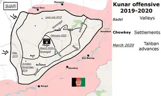 Kunar offensive (May 2019 – March 2020) was a major offensive by Taliban forces against Islamic State in Kunar province which led to conquer of their territorial stronghold and death or surrender of most IS forces. Terror cells however remained active in the area.