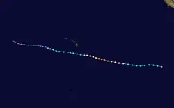 Erick originated as a tropical wave that emerged off the coastline of Africa on July 12. It entered the eastern Pacific in late July, where convection blossomed in the presence of a very strong kelvin wave. Moderately wind shear slowed the formation process, but a tropical depression finally developed around 12:00 UTC on July 27 and organized into a tropical storm six hours later. Dry air and the elongation of its center likewise slowed organization shortly after development, but a center relocation placed the storm in a favorable environment. Erick intensified into a hurricane at 18:00 UTC on July 29 and began a period of rapid intensification, intensifying by 60 mph (95 km/h) in just 24 hours as it crossed into the central Pacific basin. This bout of strengthening brought Erick to its peak as a Category 4 hurricane with winds of 130 mph (210 km/h) around 18:00 UTC on July 30. The cyclone subsequently weakened while passing south of Hawaii as wind shear increased over the system. Bursts of convection allowed Erick to persist as a tropical cyclone from August 3 to 4. However, the system eventually degenerated to a remnant low by 00:00 UTC on August 5. The remnants of Erick continued moving west and reached the International Date Line on August 8.[19]