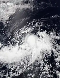 The tropical wave that spawned Cosme was succeeded a week later by another. It entered the East Pacific on July 8 but remained disorganized for several days while tracking west. The wave gave way to an area of low pressure on July 12, which then organized into a tropical depression only six hours later. The depression was located over very warm sea surface temperatures but under the influence of moderate wind shear, preventing organization. By July 12, persistent upper-level winds began to shear away the cyclone's convection. It degenerated to a remnant low at 00:00 UTC on July 14 while located south-southwest of Baja California Sur. The low produced intermittent bursts of convection as it moved west-northwest but ultimately dissipated early on July 15.[17]