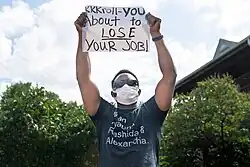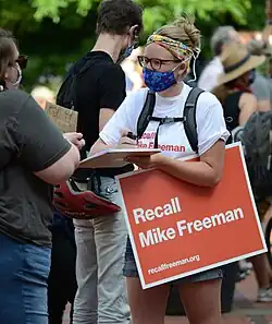 The Hennepin County Sheriff's Office deployed deputies and the county paid for private security to protect Freeman and his home against alleged threats.[41] On May 30, more than 1,000 protesters gathered outside his home, and some caused minor damage to the house.[42] A protest group gathered at the Hennepin County Government Center on June 12 to demand Freeman's resignation over his handling of previous officer-involved shootings in Minneapolis, such as the shooting of Jamar Clark and the prosecution of former police officer Mohamed Noor in the shooting of Justine Damond.[43] A group also launched a petition drive to recall Freeman.[44]