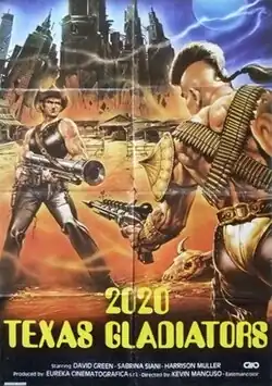 2020 Texas Gladiators (Italian: Texas 2000)[2] is an Italian science fiction action film co-directed by Joe D'Amato and George Eastman.[4] "In a post-apocalyptic Texas, a band of warriors fight against a fascist regime that is trying to take control of all surviving population."[5]