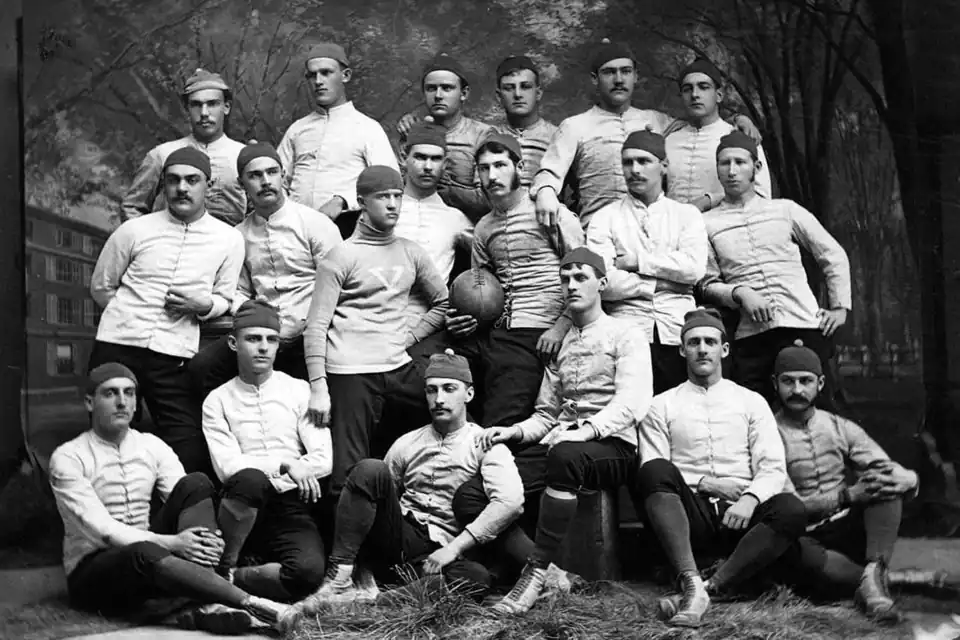 The Bulldogs were the dominant team in the early days of intercollegiate football, winning 27 college football national championships, including 26 in 38 years between 1872 and 1909.[3] Walter Camp, known as the "Father of Football", graduated from Hopkins Grammar School in 1876, and played college football at Yale College from 1876 to 1882. He later served as the head football coach at Yale from 1888 to 1892.[4] It was Camp who pioneered the fundamental transition of American football from rugby when in 1880, he succeeded in convincing the Intercollegiate Football Association to discontinue the rugby "scrum", and instead have players line up along a "line of scrimmage" for individual plays, which begin with the snap of the ball and conclude with the tackling of the ballcarrier.[5] In 1916, against the advisement of coach Tad Jones, Yale quarterback Chester J. LaRoche (1918s) helped lead the Yale team in a win against Princeton by turning the momentum of the game with a fourth-down call in the huddle to go for first down rather than punt. The team made the down and went on to win the game in one of Yale's greatest victories in its history. LaRoche went on to spearhead the creation of the National Football Foundation and Hall of Fame.[6]