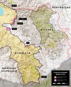 The issue of border demarcation between Armenia and Azerbaijan arose immediately after the defeat of Armenia in the Second Nagorno-Karabakh War, and Azerbaijan regaining control over its occupied territories. Before the 2020 war, there was no mutually agreed upon border between Armenia and Azerbaijan, with certain Armenian villages and agricultural workers crossing over into Azerbaijan.[88] During Soviet times, cross-border interactions and movements were common.[89][90][91]