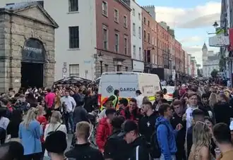 The night saw clashes between the Garda Public Order Unit and people partying on the street at South William Street, in breach of COVID-19 restrictions, where violence broke out with glass bottles and other objects being thrown before a Garda baton charge dispersed the crowd.[5][6] Footage of the baton charge was widely shared on social media with some expressing criticism at the tactics used by Gardaí on the scene. The violent attacks resulted in 14 people, including nine adults and five juveniles, arrested for public order offences, a Garda member sustaining a leg injury and receiving hospital treatment, and a Garda patrol vehicle being damaged.[7][8][9]
