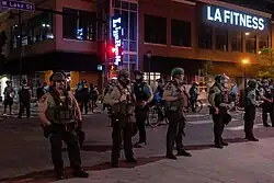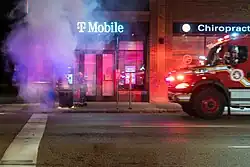 At nightfall, demonstrators blocked West Lake Street to vehicular traffic with a dumpster that they lit on fire. Overnight, dozens[10] of buildings were damaged and several fires were started in the area.[31][30][32][10] The Minneapolis Police Department gave permission for its officers responding to the unrest to use tear gas and rubber bullets if needed.[33] Instead, patrols of police officers in riot gear fired flashbangs and used other crowd disperse methods.[34][33] Authorities made nine arrests into overnight hours into June 4 for rioting, assault, obstruction, damage to property, and weapons procession.[2][35] Several buildings in Uptown were broken into and vandalized. A spate of looting occurred to some businesses in the area,[36][37][34] but the looting was not as widespread in Minneapolis as it was in late May 2020.[38][36]