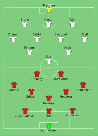 Denmark were not able to capitalize in their opening game, with Andreas Cornelius heading onto the post in the 70th minute. Although Tunisia failed to score themselves, midfielder Aïssa Laïdouni earned the Man of the Match award for his defensive heroics.[6]