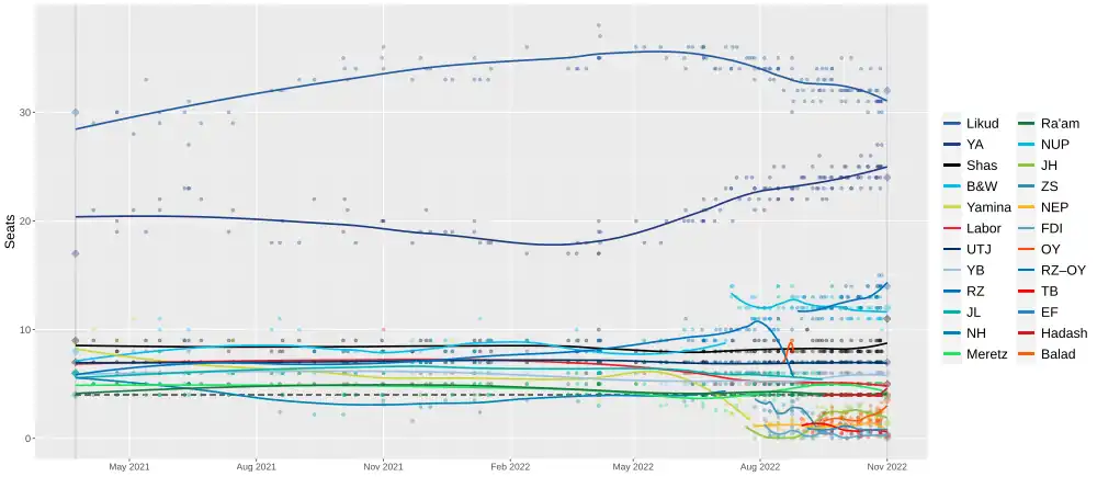 This graph shows the polling trends from the 2021 Israeli legislative election until the next election day using a 4-poll moving average. Scenario polls are not included here. For parties not crossing the electoral threshold (currently 3.25%) in any given poll, the number of seats is calculated as a percentage of the 120 total seats.
