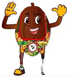 The mascot of the games was an anthropomorphised cocoa bean, wearing a multicoloured Leotard who used a prosthetic leg.[7][8] The mascot was widely mocked on social media for resembling the children's nursery rhyme character Humpty Dumpty, or the brand mascot of "Nkatie Burger" peanuts or a "Killer Bean".[9][10]