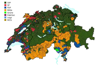 The Swiss People's Party (SVP), which campaigned against migration, performed strongly, while the Green and Green Liberal parties saw their vote share decline.[3][4][5]