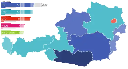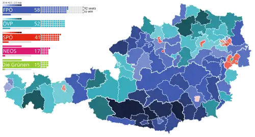 The election saw the far-right Freedom Party of Austria (FPÖ) place first, winning 28.8% of the vote and achieving the best result in the party's history. This was the first time that a far-right party won the most seats in a legislative election in Austria after World War II.[1][2][3] The governing Austrian People's Party (ÖVP) lost 20 seats, while its coalition partner, the Greens, lost 10 seats. The centre-left Social Democratic Party (SPÖ) won just 21.1%, marking its worst result ever in terms of percentages and the place occupied (3rd), but it gained one seat compared to the previous election. NEOS slightly improved from 2019, rising from 15 to 18 seats. No other party was able to clear the 4% threshold to win seats.