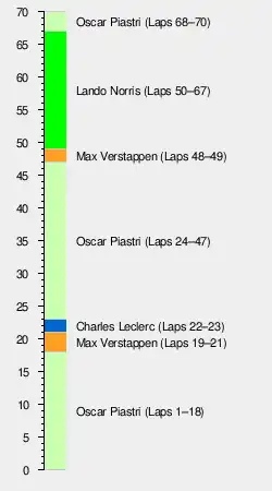 Pierre Gasly had changes made to his power unit during parc fermé, facilitating a pit lane start. He later retired from the race on lap 33 due to a suspected hydraulics leak.[15] Most cars started on the medium compound tyres with some others opting for hard compound or soft compound. Polesitter Lando Norris lost position to teammate Oscar Piastri at the start. Championship leader Max Verstappen, starting from third, took second from Norris off-track. He let Norris retake second on lap 4, to avoid a potential penalty for gaining a position off track. The pit window was open by lap 17, and everyone went in for their scheduled stops, briefly giving Charles Leclerc the lead ahead of his stop. Sergio Pérez, who ended qualifying early after damaging his car, was able to recover to the points, eventually finishing seventh.[15]