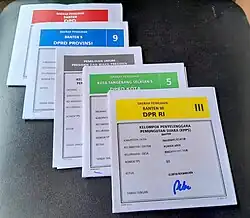 All voters were given five ballot papers: one for president and vice president, one for the House of Representatives (DPR), one for the Regional Representative Council (DPD), one for the Provincial Regional House of Representatives (DPRD Provinsi), and one for the Municipal Regional House of Representatives (DPRD Kota/Kabupaten).[5] Voters in Jakarta received just four ballot papers,[6] while overseas voters received just two.[7] Voters used a nail to poke a hole in the ballot paper indicating which party or candidate they wished to vote for, and then dipped their fingers in ink as a precaution against voter fraud.[5]