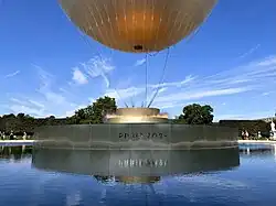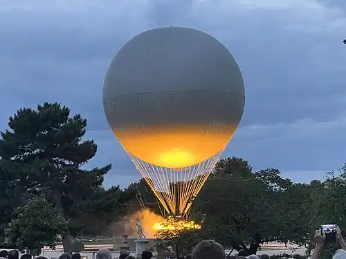 The cauldron was tethered to a wire-like conduit anchored to a platform installed in the center of the Grand Bassin Rond—a large, circular ornamental pond at the Tuileries Garden; each night during the Games, the balloon ascended into the night sky, floating aloft 60 metres (200 feet) over the Garden, illuminated against the twilight.[11] The setting was in line with landmarks such as the Louvre Pyramid, the Obelisk at Place de la Concorde, the Arc de Triomphe,[12][4] and, in the distance, the Eiffel Tower. It was operated by French balloon manufacturer Aerophile.[13]