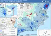 Starting on 29 October 2024, a cold drop brought drastic flash flooding to southern and south-eastern Spain, primarily in the Valencia region.[19] At 06:42, the State Meteorological Agency (AEMET) issued an orange weather warning for the south of Valencia. Less than 20 minutes later, the port of Valencia announced it would be shutting down.[20] At 07:36, the AEMET issued a red weather warning for the Valencian interior and upgraded its previous warning to the highest level. By this time, the Plana d'Utiel was already receiving heavy rain.[20] By 10:30, emergency services were rescuing people from their vehicles in Ribera.[20]