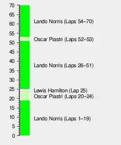 When Piastri exited the pits he found himself close behind Tsunoda and Colapinto, whom were now fighting for the 15th position. As Piastri was lapping the pair, rather than fighting them for track position, he had the right to be waved through under blue flag rules. Colapinto and Tsunoda did not follow the blue flags, with Colapinto forcing Piastri on to the grass as the trio exited Remus. Colapinto received a five-second penalty for this incident, with him stating over team radio that he had not seen Piastri coming.[19] This incident cost Piastri approximately a second to Norris. Whilst Piastri did close to the gap to Norris, he was not quite able to get with DRS range and therefore could not make an attempt for the lead. Norris took his third Grand Prix win of the season, and the seventh of his career.[20][16]