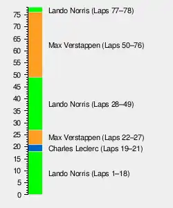 Due to the Circuit de Monaco twisty layout, lack of straights and narrow nature, there was only one overtake,[25] and zero inside the top 10,[b] with Mercedes calculating a car needed a 4.5-second pace advantage over the car in front to have even a 50–50 chance at an overtake. One of the two on-track "passes" occurred courtesy of Mercedes's George Russell's intentionally cutting the Nouvelle Chicane for which he received a drive-through penalty.[27] Several teams, including Williams, Racing Bulls, and Mercedes, gamed the new rule mandating a second pit stop by ordering one driver to hold up the rest of the field so that the other driver ahead of them could race in free air and pit without losing track position.[27][28] Max Verstappen of Red Bull Racing also attempted to take advantage of the two-stop rule by staying out on old tyres and gambling for a pit stop under safety car or red flag conditions, where he would have lost less time relative to his rivals. He took the lead after polesitter Lando Norris of McLaren took his second pit stop, but no free pit stop materialised and Verstappen was forced to pit at the end of the race, dropping him to fourth.[29]