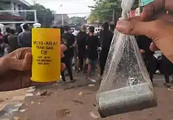 Once violence broke out, security forces quickly moved to disperse the protesters by force.[33] At first, officers deployed water cannon trucks, blasting high-pressure jets of water at those attempting to breach the Pendopo gates. When that failed to deter the most aggressive demonstrators, police resorted to firing tear gas canisters into the crowd. Smoke grenades were also used.[18] Pushed back, protesters had to take to take shelter to a local mosque. Tempo reports that police would then deliberately fire tear gas towards the mosque to further dispurse the protestors. Police also shot tear gas towards ambulances leading medical workers to relocate farther west from the square.[34] Approximately 40 individuals were rushed to the hospital after police deployed tear gas against demonstrators.[35] The Jakarta Post describes that most of those treated suffered from breathing difficulties due to tear gas exposure. It also notes that two police officers were wounded in the chaos.[36]
