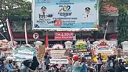 The planned "demonstration" took place on Wednesday, August 13, 2025, and quickly grew into one of the largest mass actions in Pati’s history.[9] Starting 8:00 AM in the morning,[18] people began to converge at the Alun-Alun Pati (town square) and the adjacent Pendopo Kabupaten Pati (the regent’s office pavilion). Many of the protesters were trucked from rural villages across the regency, moving to the city center before dawn.[19][20] By mid-morning, the crowd carrying Indonesian flags, banners and shouting slogans filled the area in front of the Pendopo. Protesters chanted and held signs demanding Regent Sudewo step down ("Turunkan Bupati Sudewo").[21][19] Demonstration leaders took turns giving speeches via loudspeakers, emphasizing that the regent’s "arrogant" behavior and unpopular policies could no longer be tolerated.[20] They urged participants to remain disciplined and avoid anarchic acts, framing the protest as a show that "Pati’s citizens are polite, peace-loving, and not arrogant."[12] Local businesses and markets closed as traders, farmers, students, and civil society groups joined the rally, including the elderly and youth (Pemuda), heeding the alliance’s call for a general mobilization.[22][23]