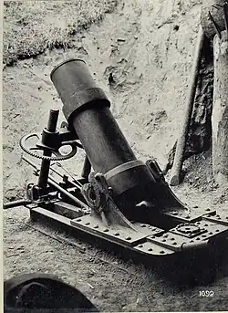 The 22.5 cm Minenwerfer M 15 was a heavy mortar used by Austria-Hungary in World War I.[1] It was developed by Böhler as an alternative to the German Ehrhardt 25 cm schwere Minenwerfer which Böhler was having problems building under license. It was a muzzle-loading, smooth-bore mortar that had no recoil system whatsoever. The entire mortar had to be levered around to aim at new targets. It was not particularly accurate and bombs often fell over in flight and landed on their sides so they used time instead of contact fuzes. It fired high-explosive and gas shells. For transport two wheels from the Gebirgsgechütz M 99 were used.