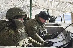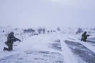 Colonel Alexey Naumets became the regiment's commander on 2 June 2007.[10] In 2008, the regiment invaded Georgia with the rest of the division.[11] It fought in the Battle of Kodori Gorge.[12] The regiment was granted the title 'Guards' on 3 June 2013.[3] The regiment contributed a battalion tactical group to participate in the August 2014 Russian military intervention in the war in Donbas.[13] A group took part in the battle of Ilovaisk, where a column of regiments' fighting vehicles was photographed by regiment's soldier in front of destroyed R-149BMR command vehicle of the Ukrainian 121st Signal Brigade.[14] In March 2015, the regiment opened its museum in Stavropol.[15]