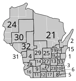 | 24 | Green County | Ashland, Barron, Bayfield, Burnett, Douglas, Pierce, Polk, St. Croix counties |