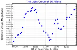 26 Arietis is a variable star in the northern constellation of Aries. 26 Arietis is the Flamsteed designation; it also bears the variable star designation UU Arietis. The apparent visual magnitude of this star is 6.14,[5] which, according to the Bortle Dark-Sky Scale, is within the naked eye visibility limit in dark rural skies. The annual parallax shift of 13.78 mas[2] is equivalent to a distance of approximately 215 light-years (66 parsecs) from Earth. The star is receding from the Earth with a heliocentric radial velocity of +15 km/s.[6]