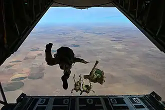 ![]() Members from the 26th Special Tactics Squadron in a free fall jump from an MC-130J Commando II | |