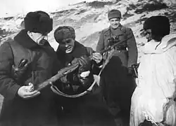 During October, a senior sergeant of the 2nd Battalion, 1047th Rifle Regiment, Vasili Grigorievich Zaitsev, was brought to Colonel Batyuk's attention. Zaitsev was one of the replacements transferred from the Pacific Fleet in August and was gaining a reputation as a highly effective sharpshooter with the standard Mosin–Nagant rifle.[19] Batyuk recommended him for sniper training, and later ordered him to set up a sniper training school of his own. Before being wounded in January, 1943, Zaitsev was credited with an estimated 300 kills, and became a Hero of the Soviet Union in March.[20] The German offensive was renewed on October 17 in the factory district, and as a result of the 308th and 138th Rifle Divisions falling back near the Barrikady Factory, General Chuikov was forced to relocate his headquarters to a bunker south of the Bannyi Ravine, about 800 metres east of the 284th's front line trenches. It would remain in this position for the duration of the battle. On October 20 Chuikov reinforced a counterattack towards the Barrikady with a battalion of the 1043rd Regiment; he now enjoyed some flexibility in employing his scant reserves. In his after action report on October 24, Chuikov reported: