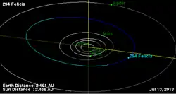 294 Felicia is a sizeable Main belt asteroid. It is approximately 35 km in diameter and has an orbital period of 5.5 years.[2] It was discovered by Auguste Charlois on 15 July 1890 in Nice.