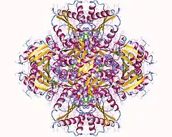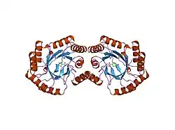 The best studied type I enzyme is from Escherichia coli (gene aroD) and related bacteria. It is a homodimeric protein. In fungi, dehydroquinase forms the core of the pentafunctional AROM complex, which catalyses five consecutive steps in the shikimate pathway.[3] A histidine is involved in the catalytic mechanism.[4]