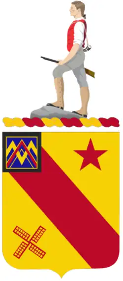 The regiment's coat of arms included a yellow shield divided by a diagonal red stripe with the shield of the New York National Guard's 51st Machine Gun Squadron in the canton. The wings of a windmill were depicted in red in the lower left below the stripe, while a red star was located in the upper right above the stripe. The star represented the regiment's initial organization in Texas, the stripe symbolized its conversion to artillery, and the canton represented the regiment's initial composition, as more than half of its personnel in the interwar period were ex-members of the 51st Machine Gun Squadron. The Organized Reserve's Minuteman crest was located above the shield.[6]