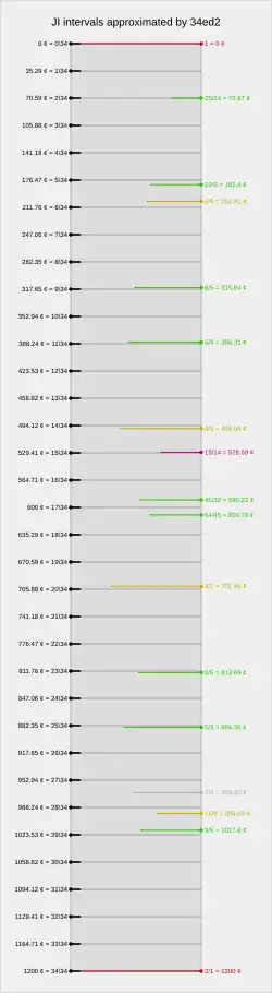 In musical theory, 34 equal temperament, also referred to as 34-TET, 34-EDO or 34-ET, is the tempered tuning derived by dividing the octave into 34 equal-sized steps (equal frequency ratios). Play Each step represents a frequency ratio of 342, or 35.29 cents Play.
